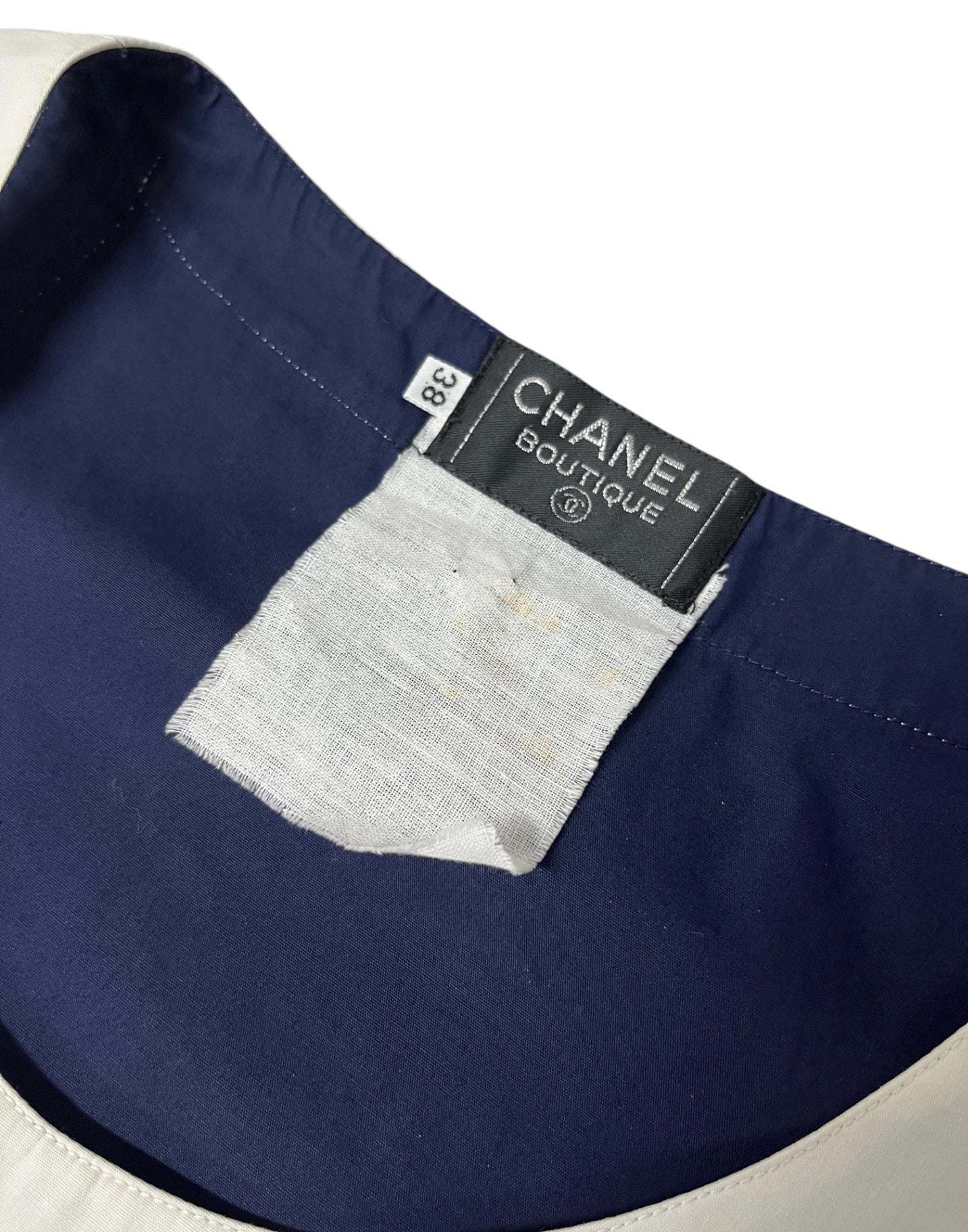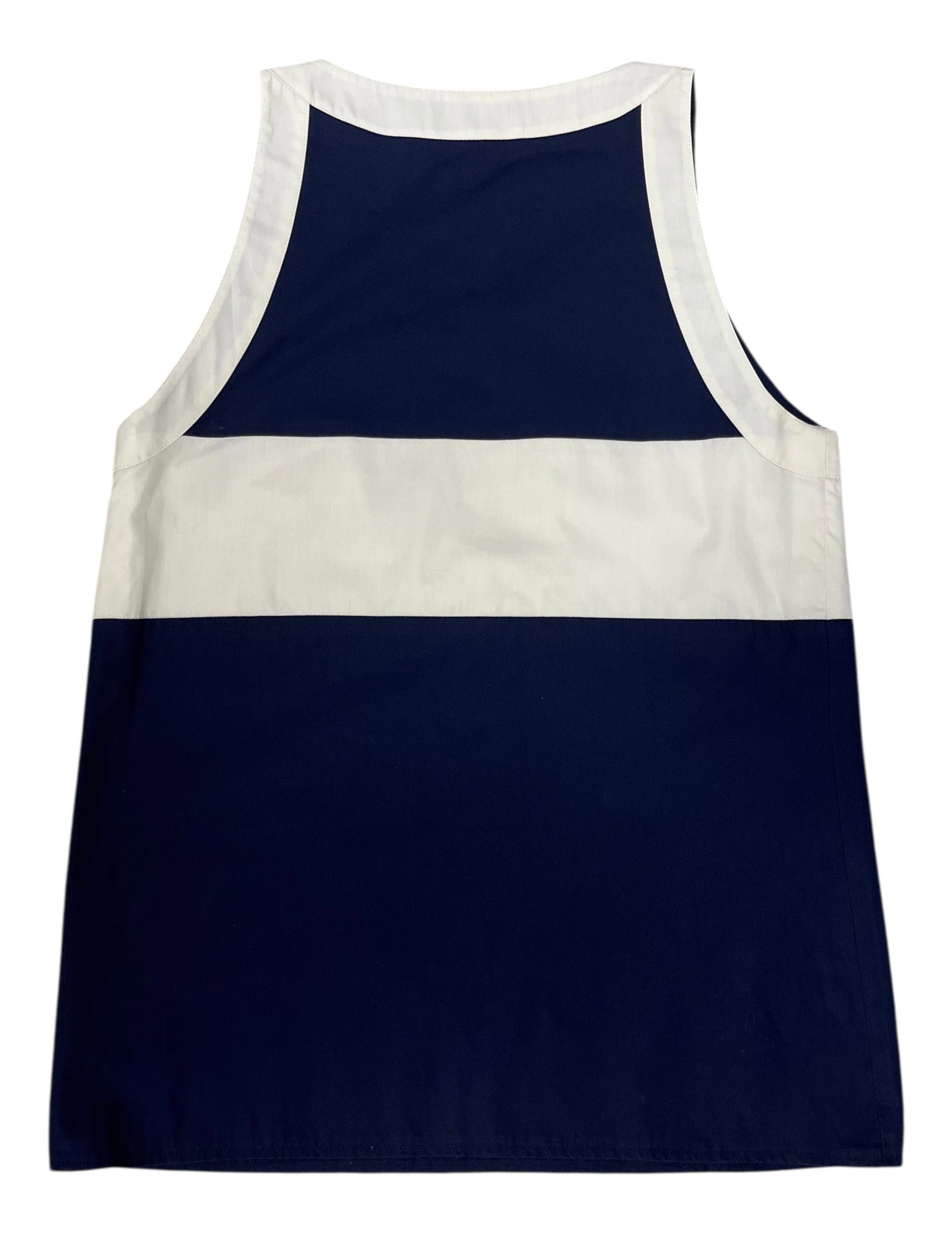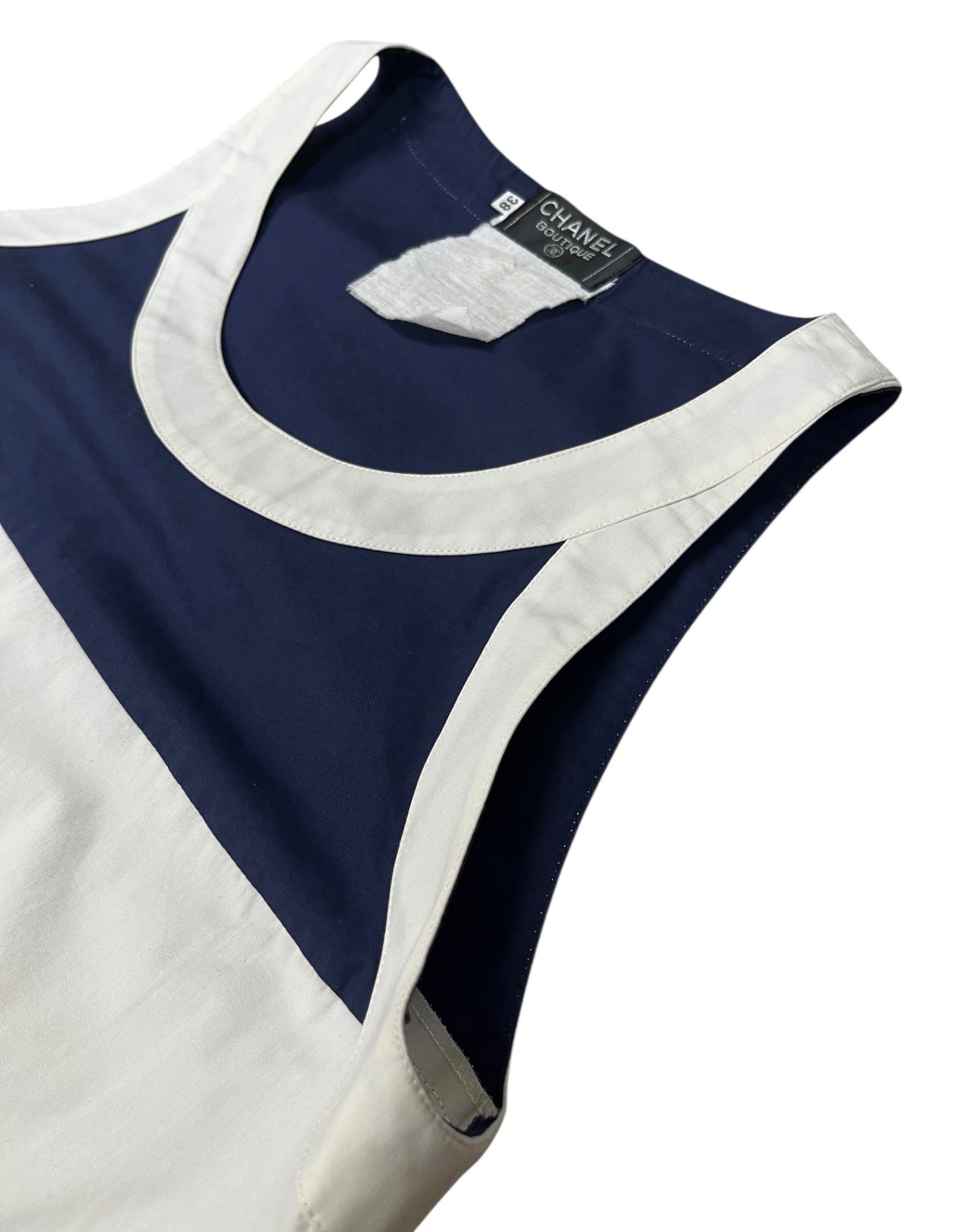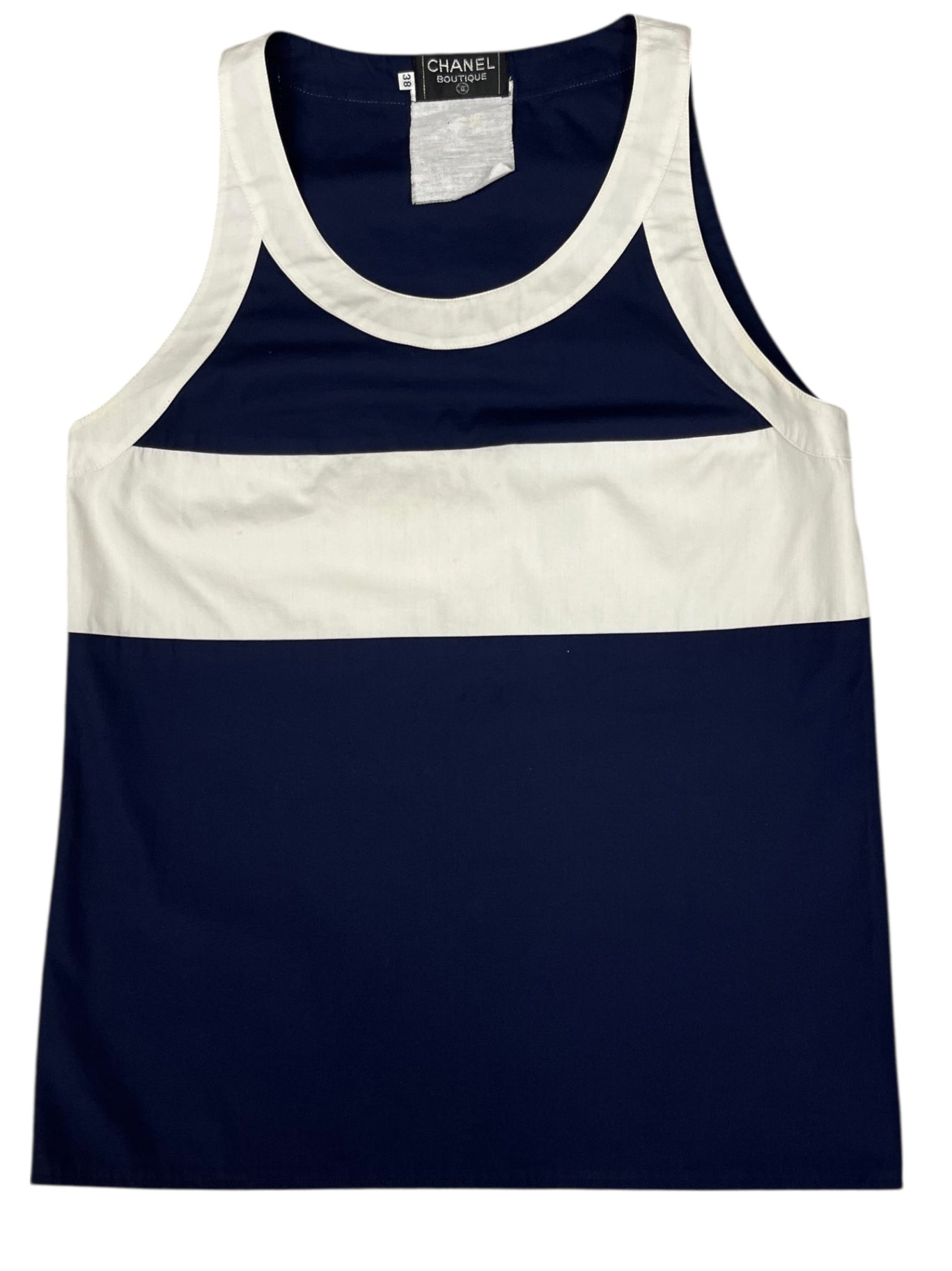 This vintage Chanel blouse features a clean, minimalist design in deep navy with contrasting white trim, offering a refined yet effortless look. The sleeveless cut and soft structure make it an easy piece to wear, whether styled casually or dressed up. A timeless wardrobe staple with subtle Chanel detailing throughout.
