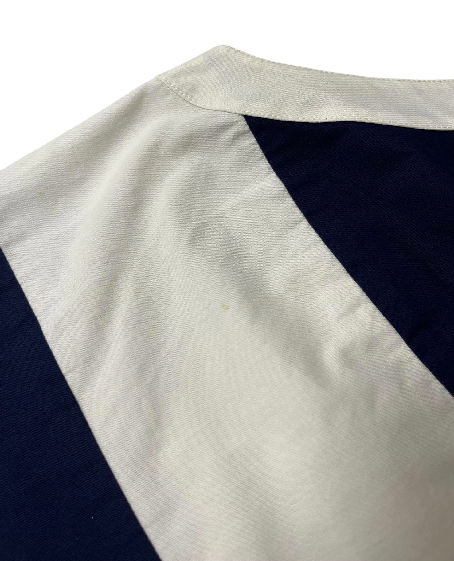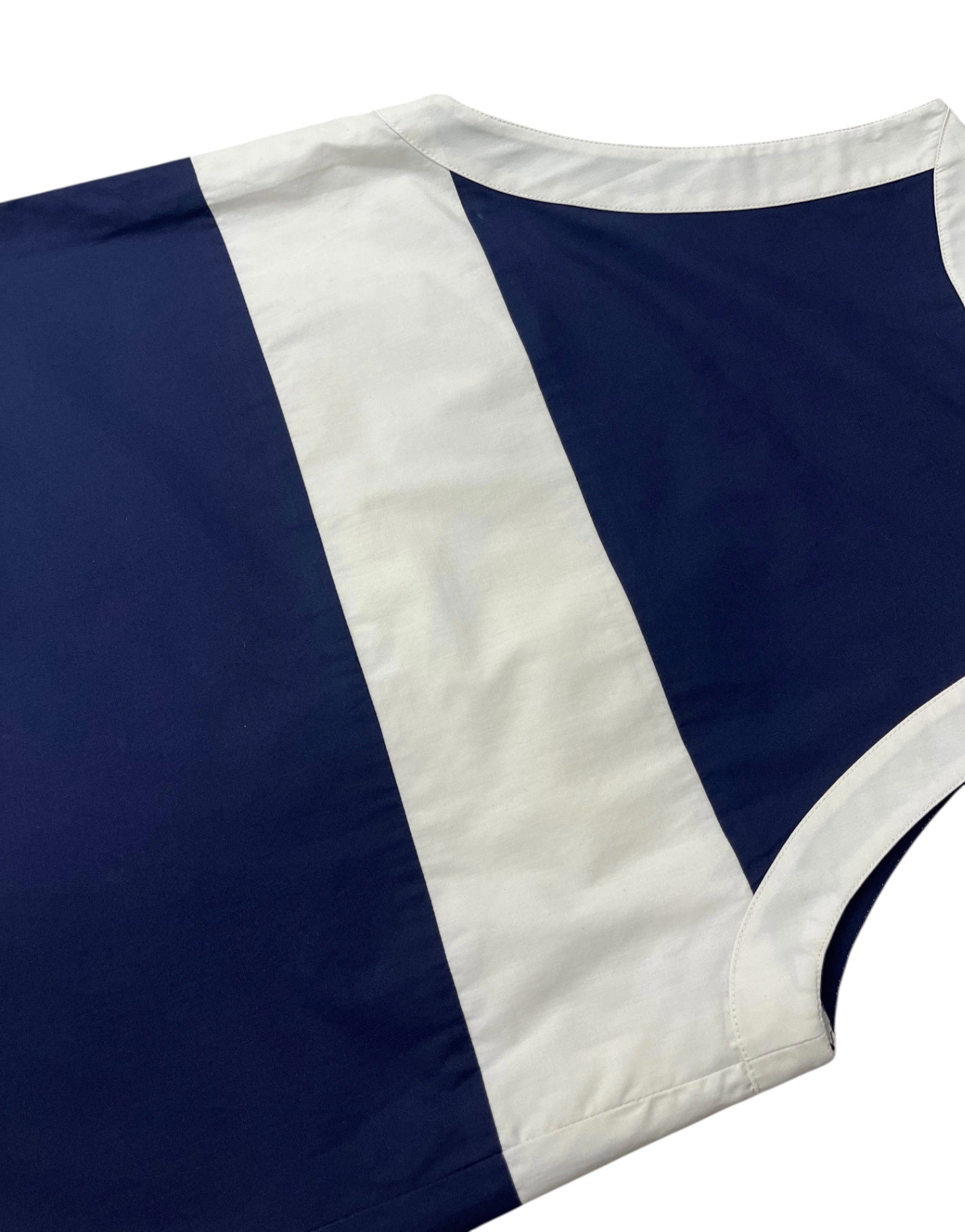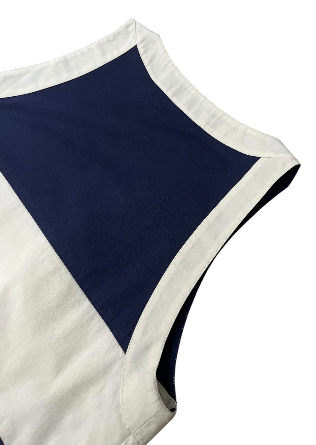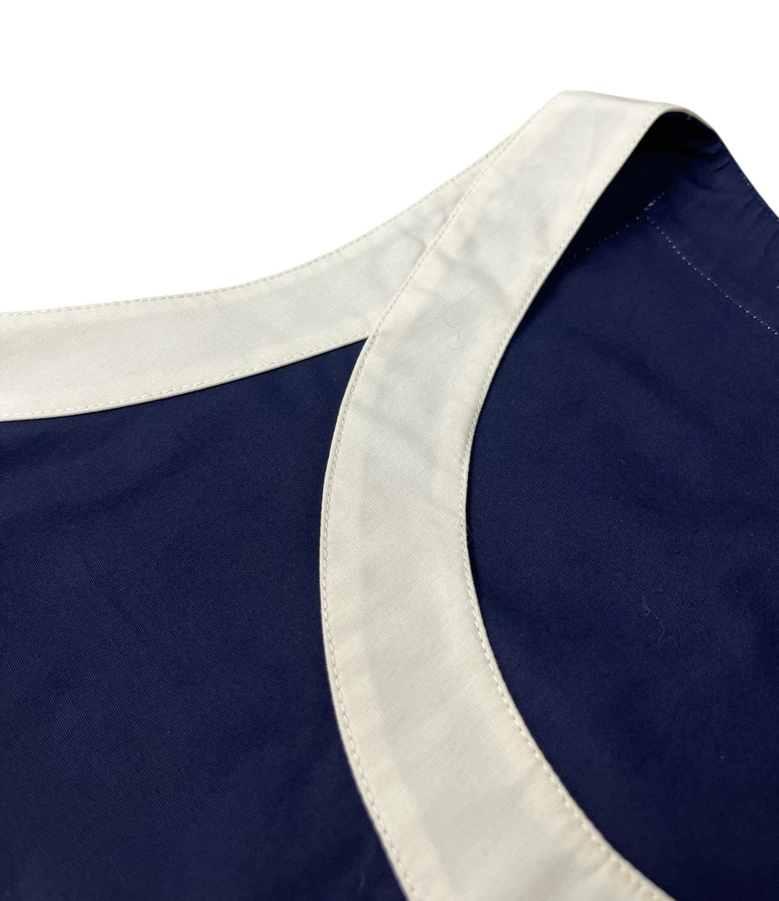 This vintage Chanel blouse features a clean, minimalist design in deep navy with contrasting white trim, offering a refined yet effortless look. The sleeveless cut and soft structure make it an easy piece to wear, whether styled casually or dressed up. A timeless wardrobe staple with subtle Chanel detailing throughout.